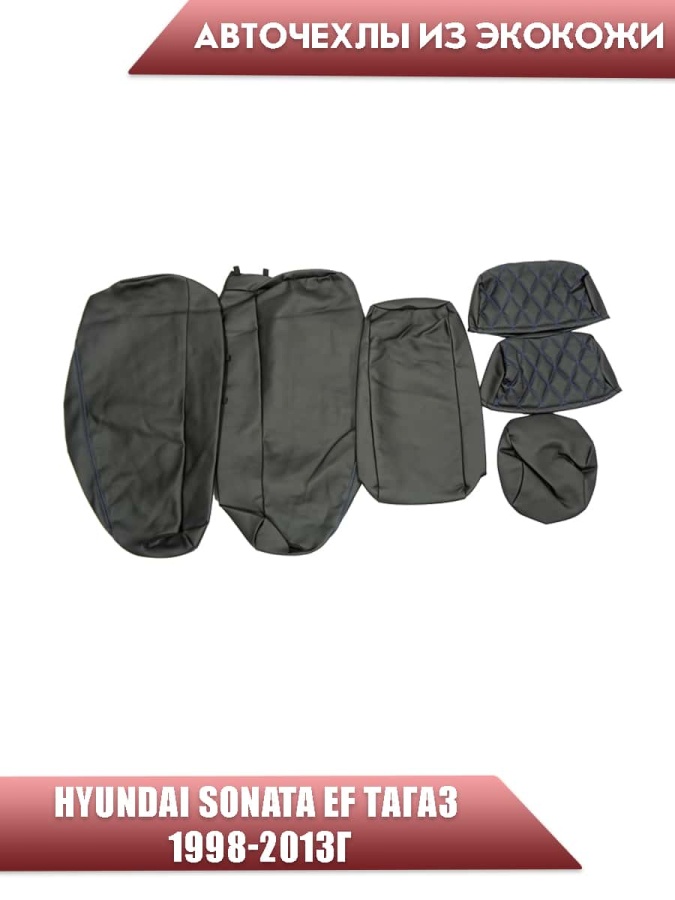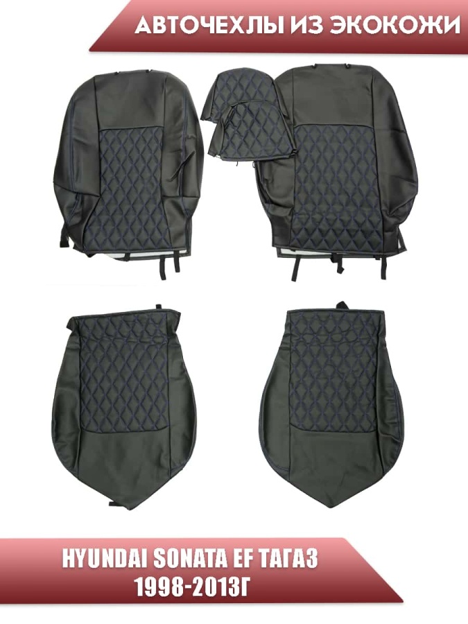 Авточехлы Hyundai Sonata EF Хендай Соната Тагаз 1998-2013г экокожа черная синяя нить ромб
