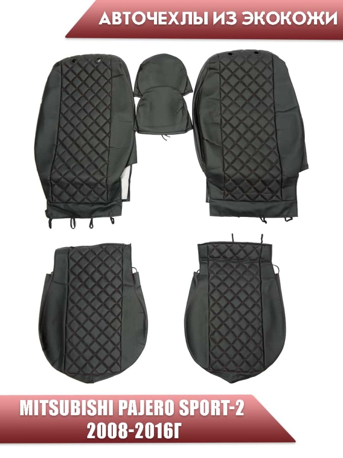 Авточехлы Mitsubishi Pajero sport-2 Мицубиси Паджеро спорт-2 2008-2016г экокожа черн крас.нить ромб