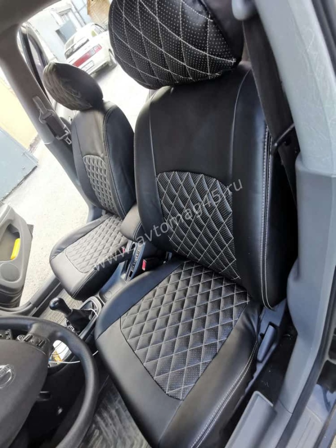 Авточехлы Nissan Almera Ниссан Альмера 2000-2006г кузов N16 2/3 экокожа черная серая нить ромб