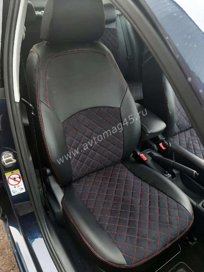 Авточехлы Skoda Rapid с 2012г 2/3 Volkswagen Polo л/б с 2020г экокожа алькантара черная крас.н ромб