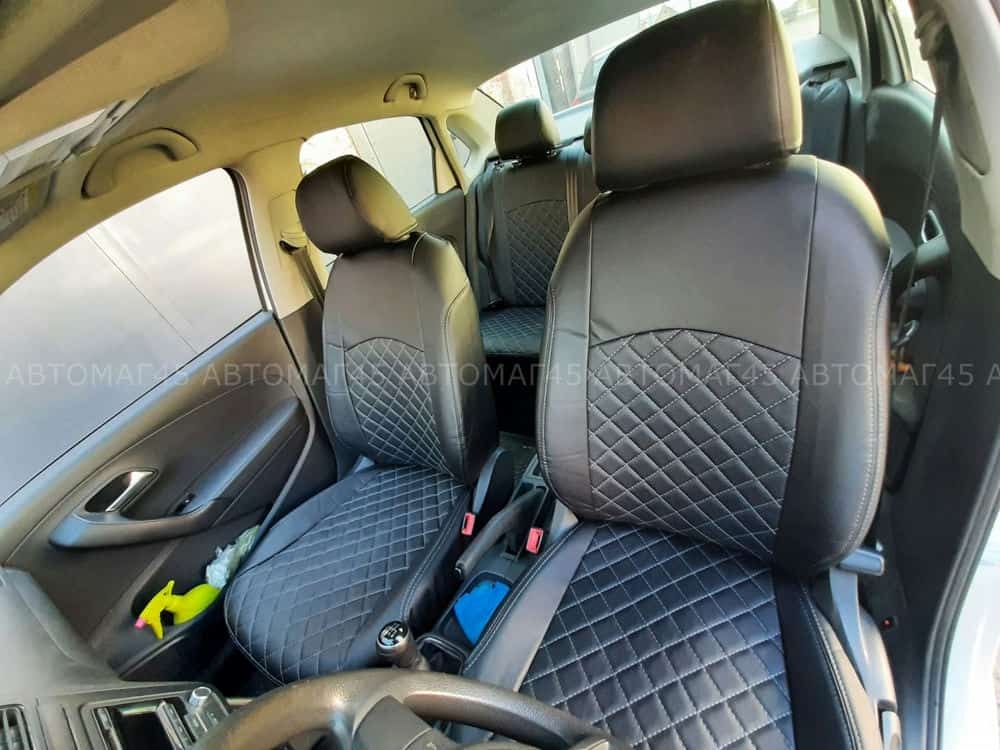 Авточехлы Volkswagen Polo Фольцваген Поло седан 1/1 2010-2020г экокожа черная синяя нить Ромб