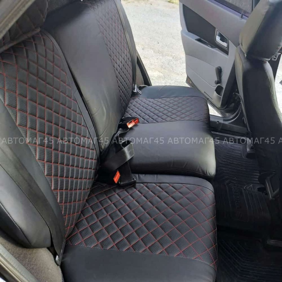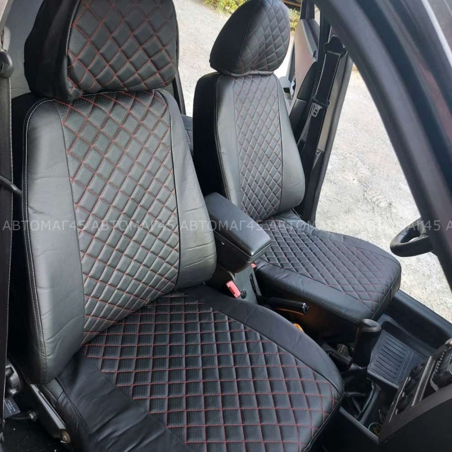 Авточехлы ВАЗ 2111 2112 Приора хэтчбек до 2014г экокожа черная с красной ниткой ромб Барс