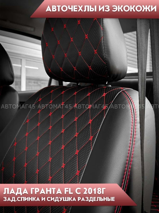 Авточехлы Лада Granta Гранта 2/3 с 08.2018г экокожа черная красная нить ромб Офис