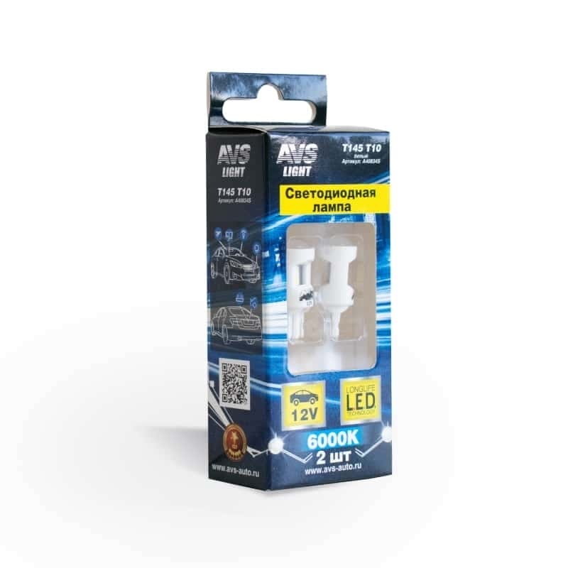 AVS лампа светодиодная Т10 200Lm W5W 12-24V 6диодов 6000K с обманкой 2шт