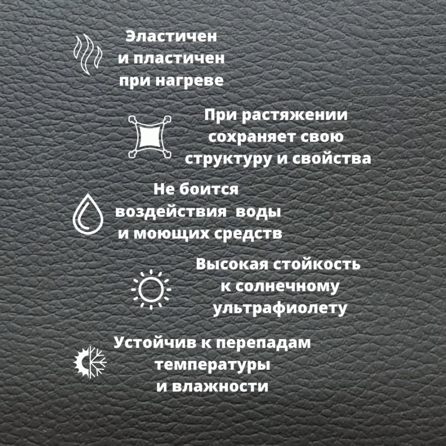 Матовый материл практически не отличим от натуральной кожи по тактильным ощущениям и внешнему виду.Применяется в обтяжке рулей, передних панелей, дверных карт, подлокотников и внутрисалонного пластика.Имеет стрейчевую основу, тянется во все стороны.