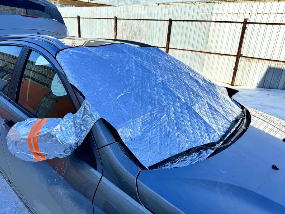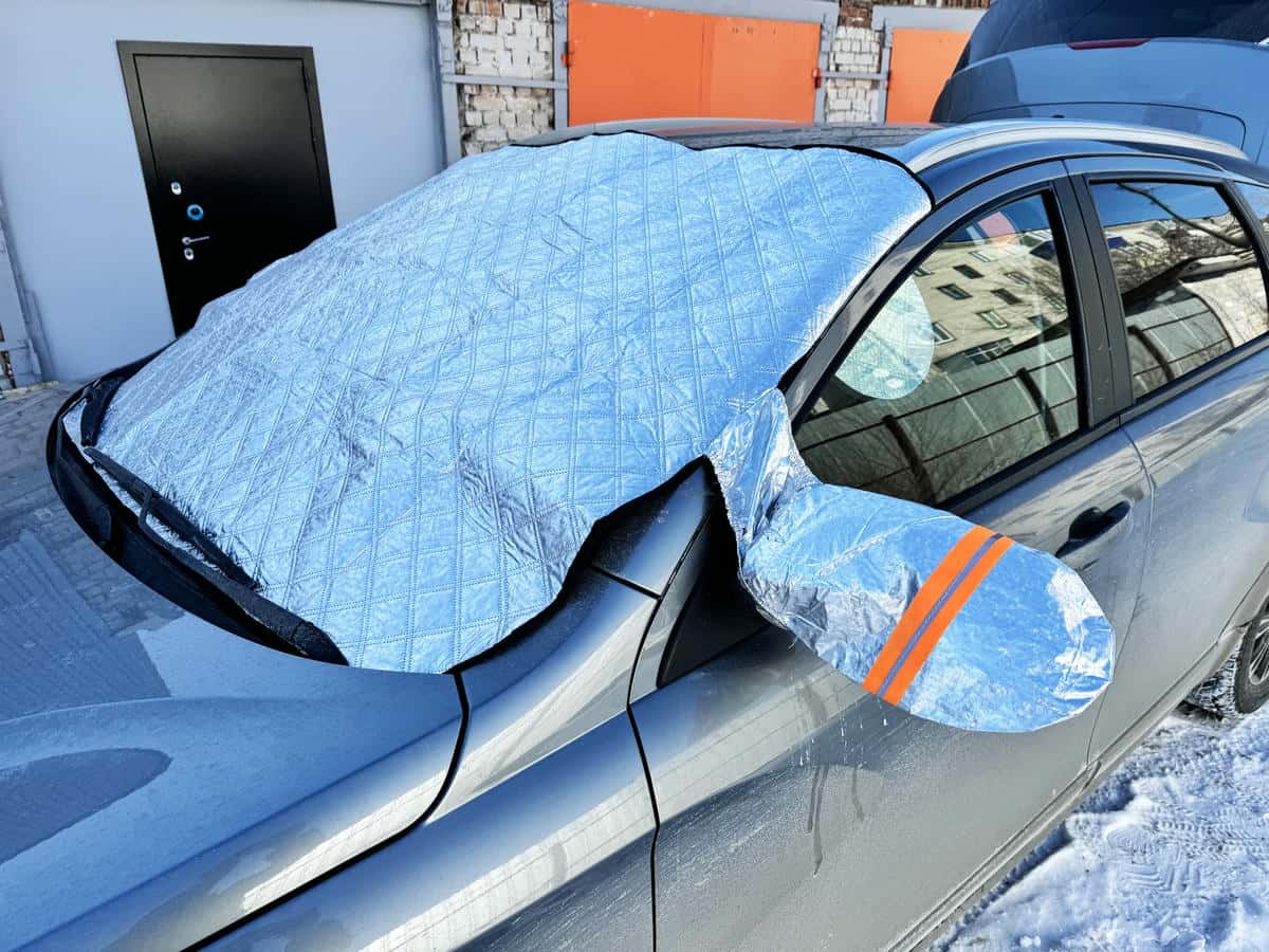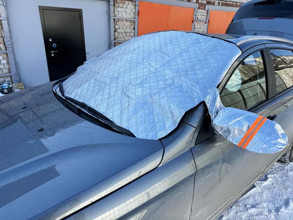 Накидку легко закрепить, и благодаря своему универсальному дизайну идеально подходит для всех моделей автомобилей! Она оснащена двумя основными точками крепления – «ушки» на боковые зеркала и вставки в двери, а также дополнительной точкой крепления с помощью магнитов на капот. Однако стоит учесть, что из-за плотного материала накидки и наслоений снега на капоте магниты могут не всегда надежно крепиться. В случае, если нижний край накидки приподнимает ветер, рекомендуется зафиксировать её с помощью дворников для большей устойчивости.