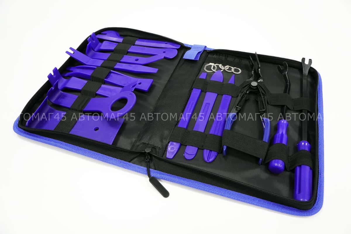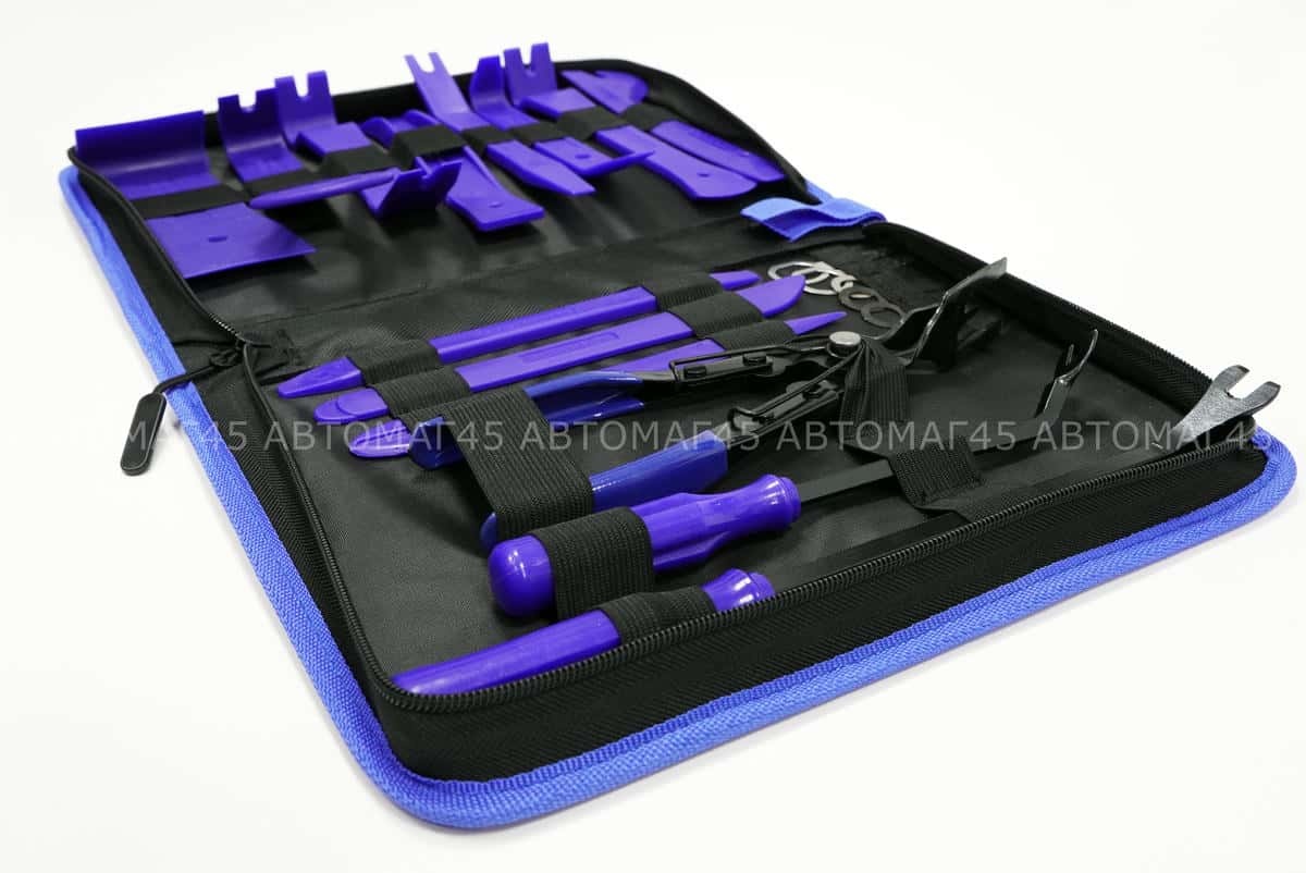 В наборах присутствует различные виды наборов ключей съемников лопатки, скребок для стекол, шпатель, ключи, вилочки и клипсодеры для работ: обшивки салона, инструмент для разборки салона; Облицовки панелей и клипс. Набор для установки и снятия радио/cd проигрывателя автомобиля и др.