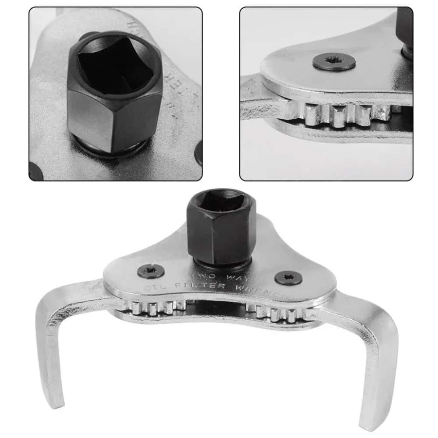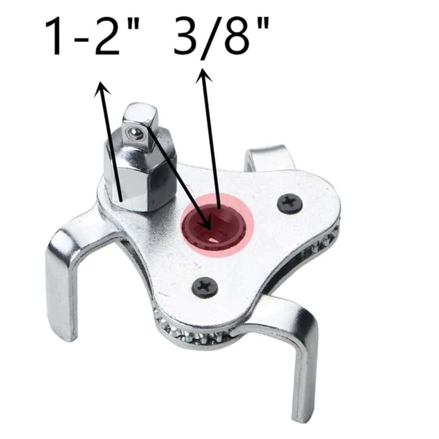 -Съемник поставляется в комплекте с двумя ключами разного размера: съемником масляного фильтра 3/8" и переходником 1/2". Это обеспечивает универсальность инструмента и его совместимость с различными ручками и гайками. Переходник 1/2" расширяет возможности использования съемника, позволяя работать с более крупными гайками.