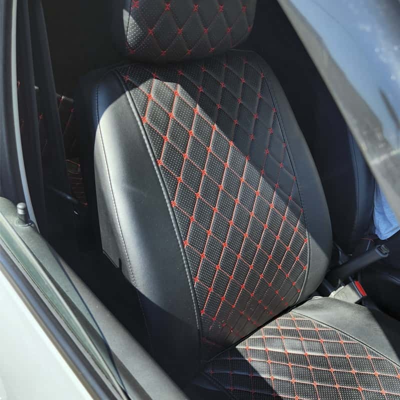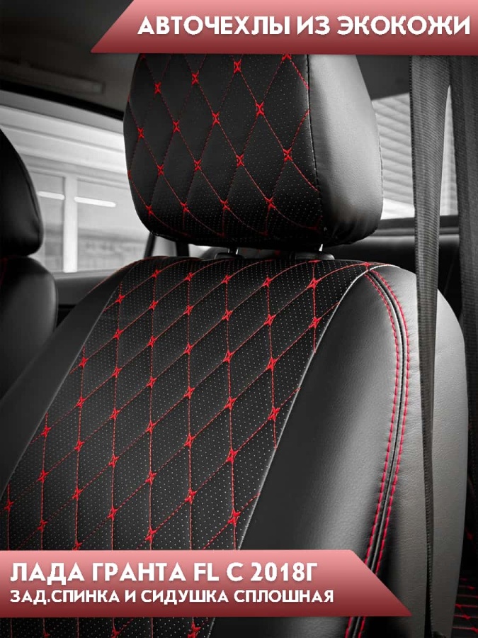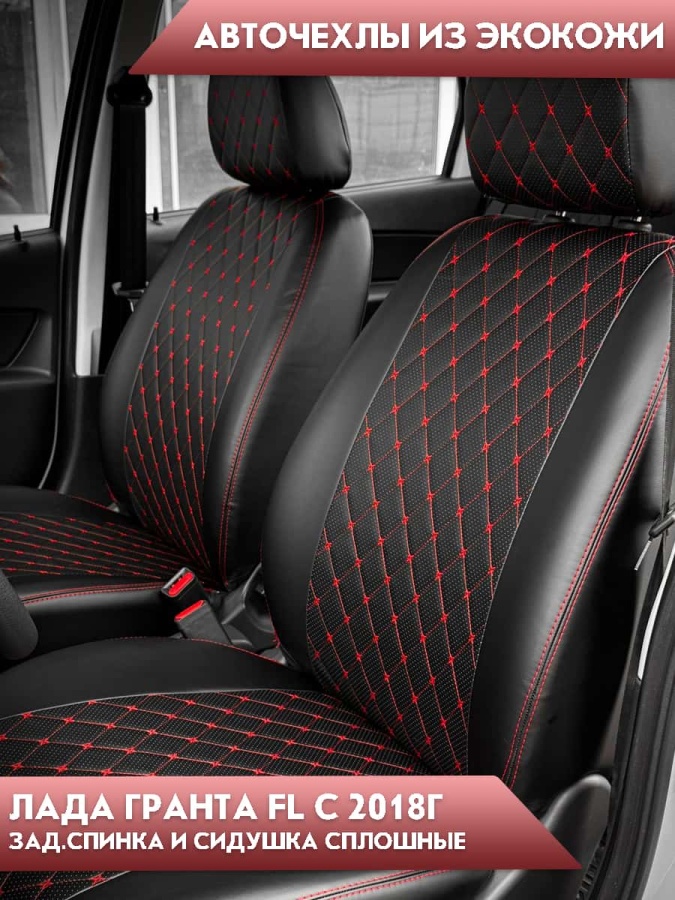 Авточехлы Лада Granta Гранта 1/1 с 08.2018г экокожа черная с красной ниткой ромб Офис