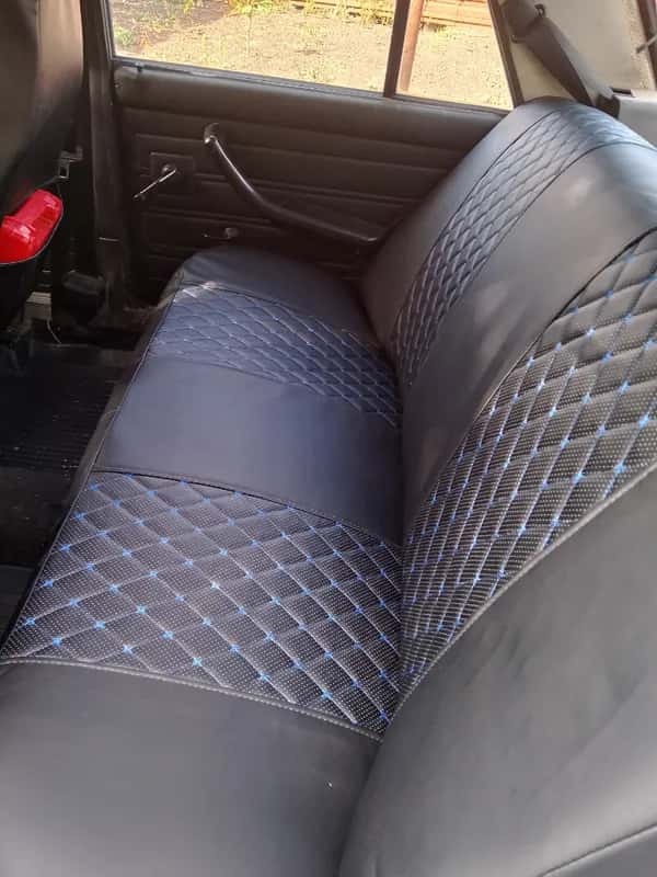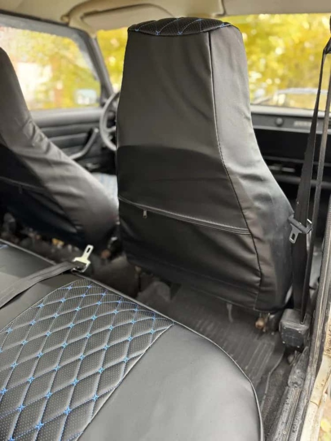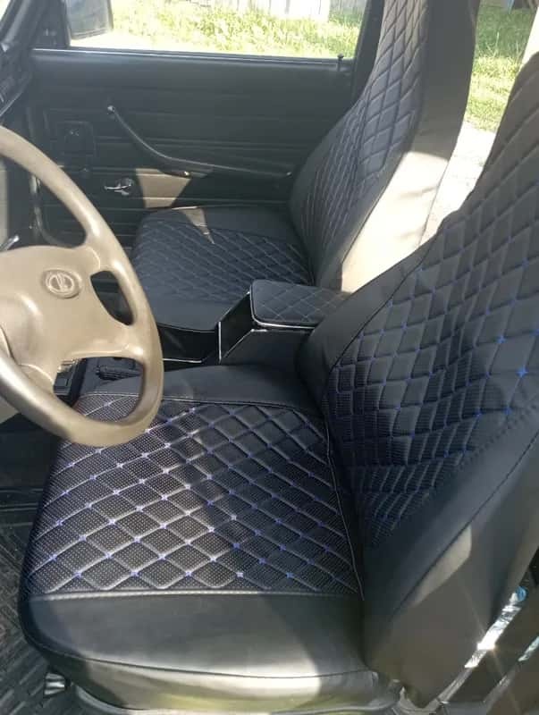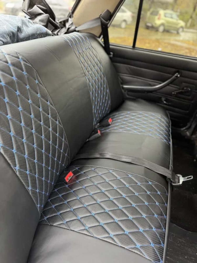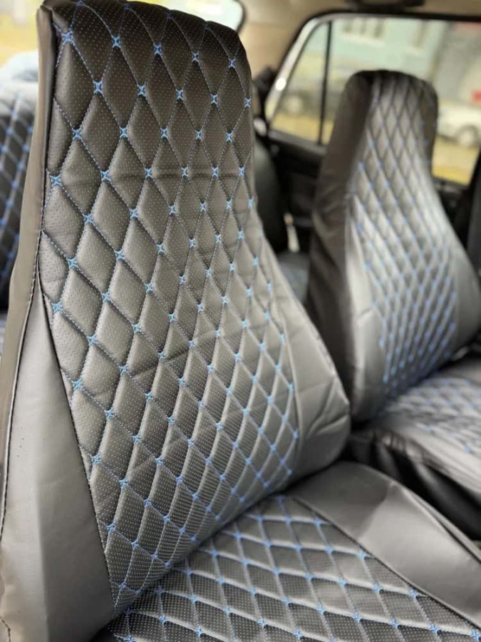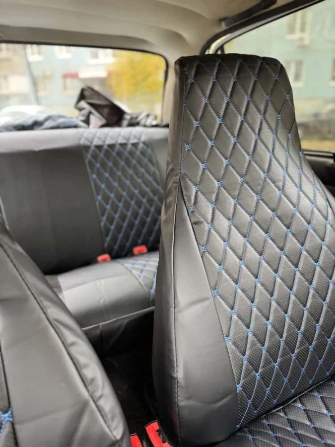 Авточехлы ВАЗ 2107 экокожа черный с синей ниткой ромб Барс