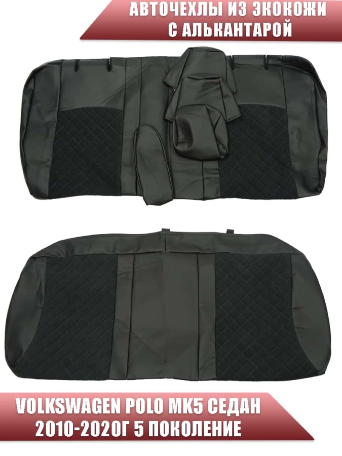 Авточехлы Volkswagen Polo Поло седан 1/1 2010-2020г экокожа алькантара черная синяя нить ромб