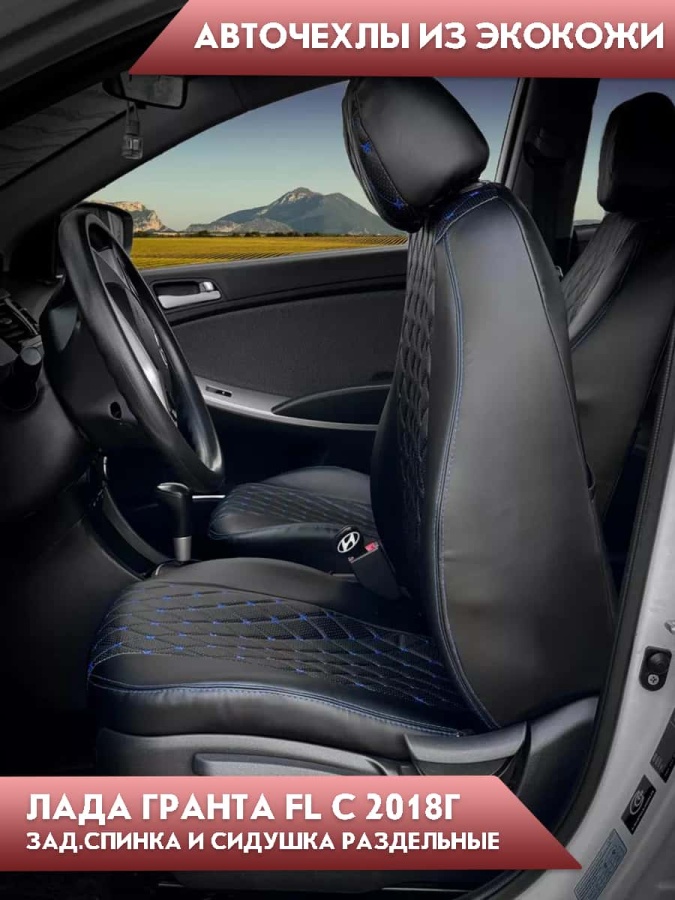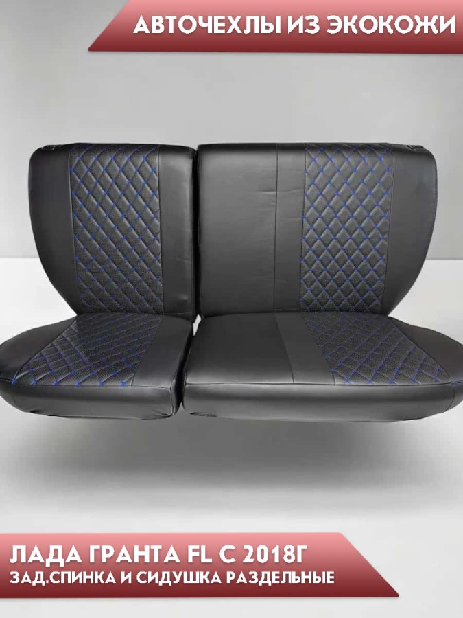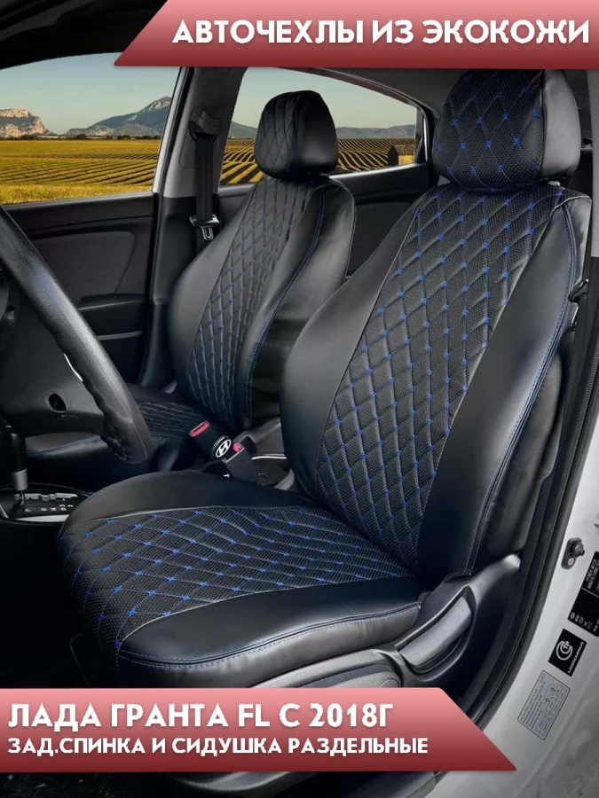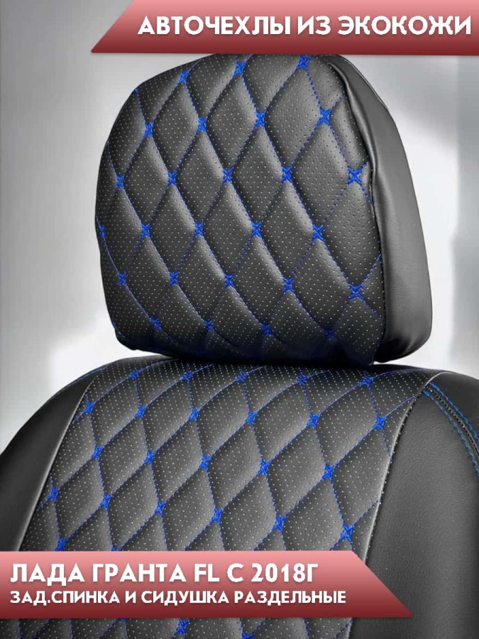 Авточехлы Лада Granta Гранта 2/3 с 08.2018г экокожа черная синяя нить ромб Офис