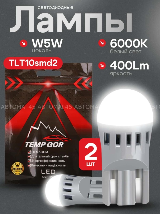 TGOR лампа светодиодная W5W 400Lm 2SMD 6000K 12v 2шт гарантия 1мес