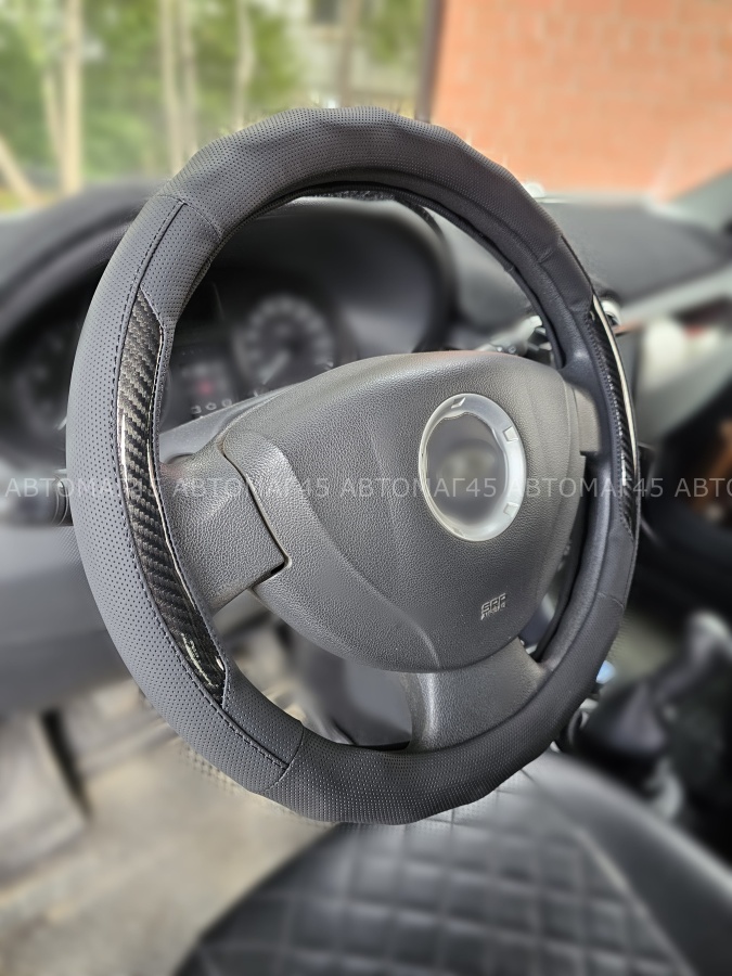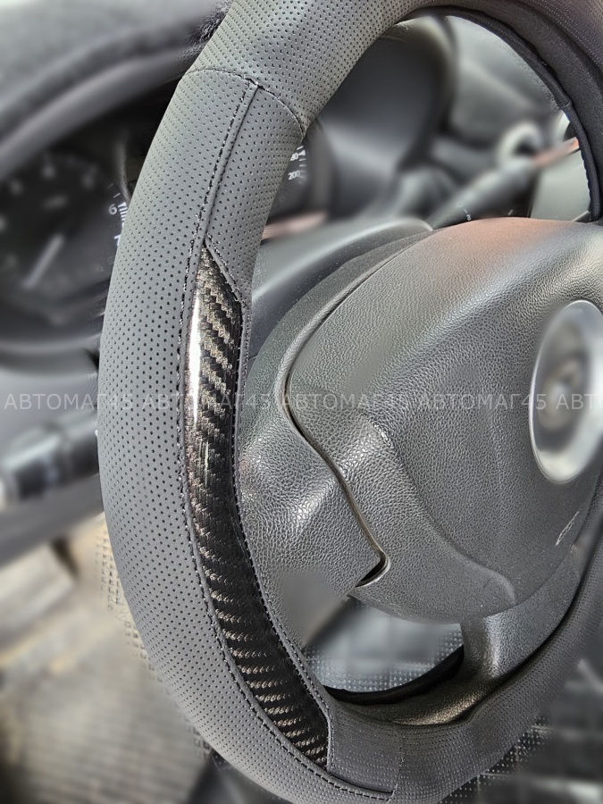 Оплетка на руль выполнена из перфорированной эко-кожи с анатомическими вставками для удобного вождения + добавлены элементы из карбона черного цвета.