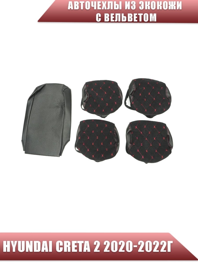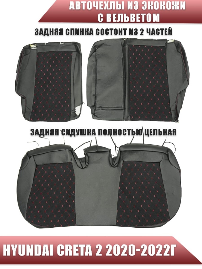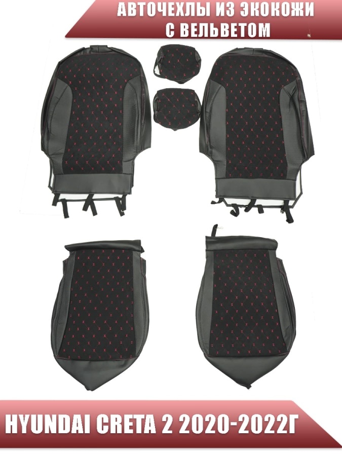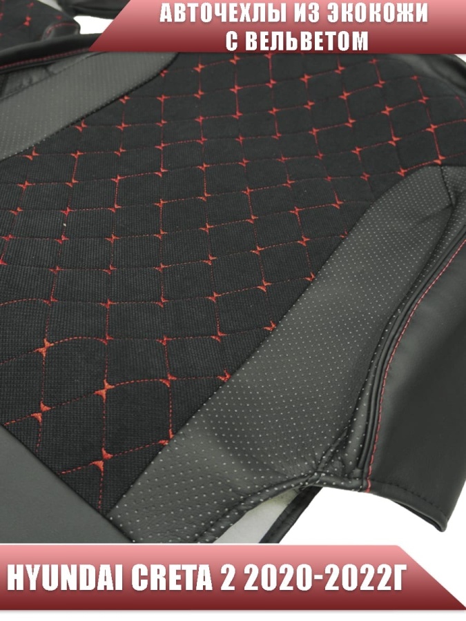 Авточехлы Hyundai Creta 2 Хендай Крета 2 2020-2022г экокожа вельвет черная красная нить ромб