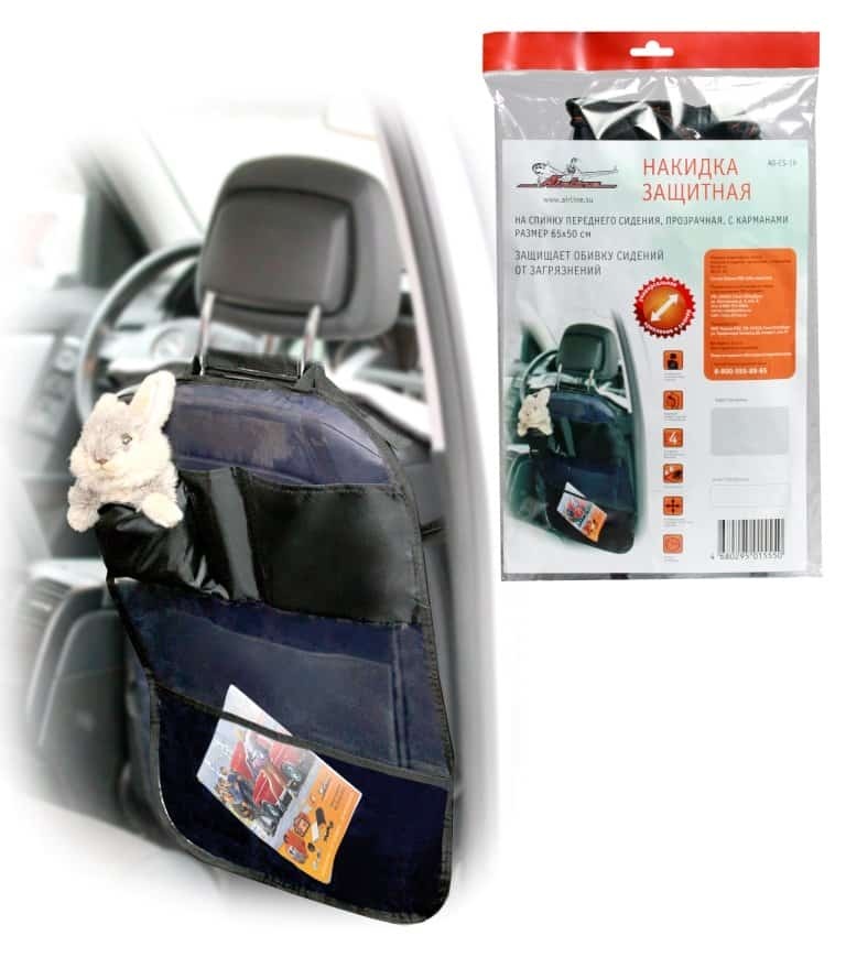 Накидка на спинку сиденья является не только предохраняет от загрязнений, но так же играет роль автомобильного органайзера. Размер изделия 65х50 см покрывает всю площадь поверхности спинки сиденья. Накидка изготовлена из прочной прозрачной пленки и полиэстеровых вставок. Карманы на накидке помогают поддержанию порядка в машине и позволяют хранить автомобильные принадлежности в одном месте.