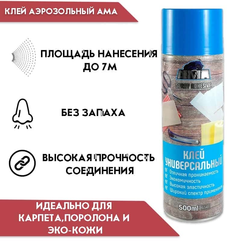 Клей аэрозольный универсальный АМА – синтетический, неопреновый, многоцелевой распыляемый клей на основе полихлоропреновых и фенольных каучуков и воспламеняемого растворителя, не содержит фреон, практически без запаха, имеет превосходные склеивающие качества и долгое открытое время, дает высокую прочность соединения.