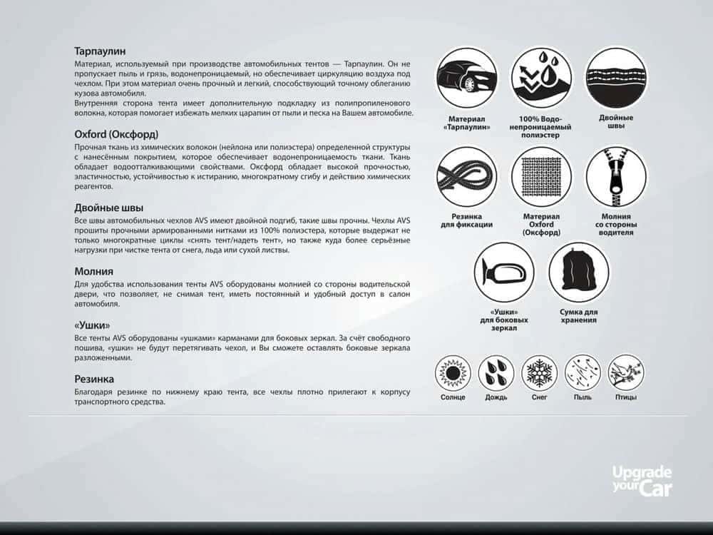Водонепроницаемый защитный чехол-тент AVS защищает лакокрасочное покрытие автомобиля от выцветания и от ультрафиолета. Выполнен из полиэстера. Чехол стоек к внешним химическим воздействиям и обладает хорошей термоизоляцией.