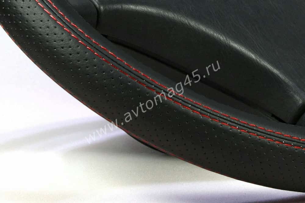 Оплетка на руль выполнена в сочетании двух видов экокожи, гладкая и перфорация+прострочена красной ниткой