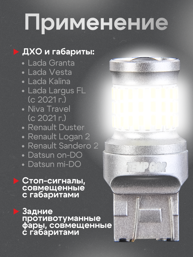 Для Лада Гранта и Лады Весты, светодиодные лампы обеспечивают энергоэффективное освещение, яркость каждой лампы достигает 570 люменов, что существенно увеличивает обзор дороги и повышает безопасность водителя и пассажиров. Они часто используются в аксессуарах на гранту, дхо гранта, дхо веста и ходовые огни гранта и веста.