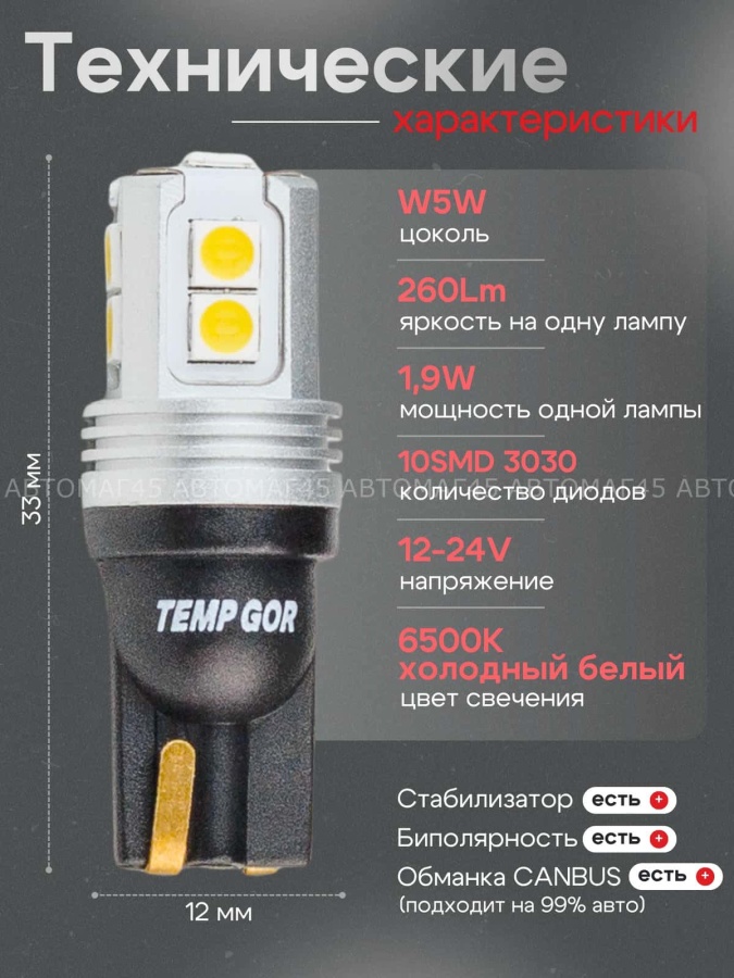TGOR лампа светодиодная W5W 480Lm 10SMD 12-24v с обманкой 2шт гарантия 1мес