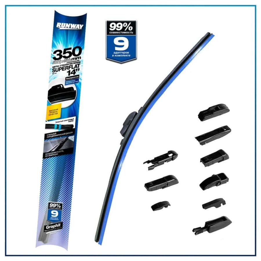 Конструкция Универсальной щетки стеклоочистителя RUNWAY бескаркасной с графитовым покрытием подстраивается под кривизну конкретного лобового или заднего стекла той или иной автомобильной марки и модели и обеспечивает качественную очистку стекла в любую погоду. Щетка стеклоочистителя RUNWAY изготовлена по современным стандартам и подходит для 99% моделей авто. 10 адаптеров в комплекте.