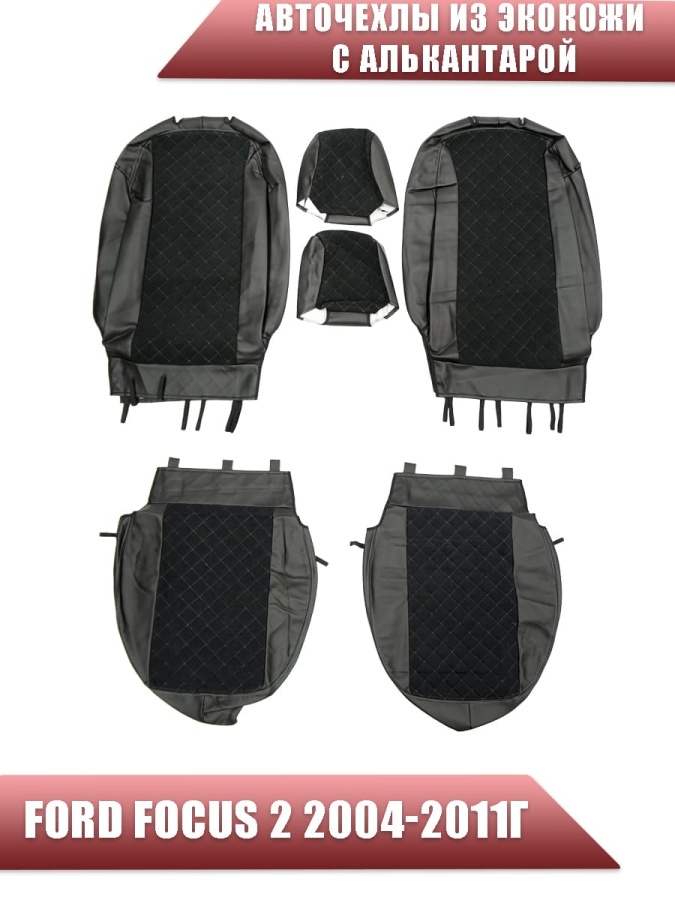 Авточехлы Ford Focus 2 Форд Фокус 2 экокожа алькантара черная серая нить ромб