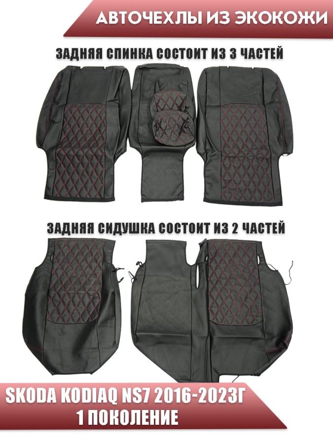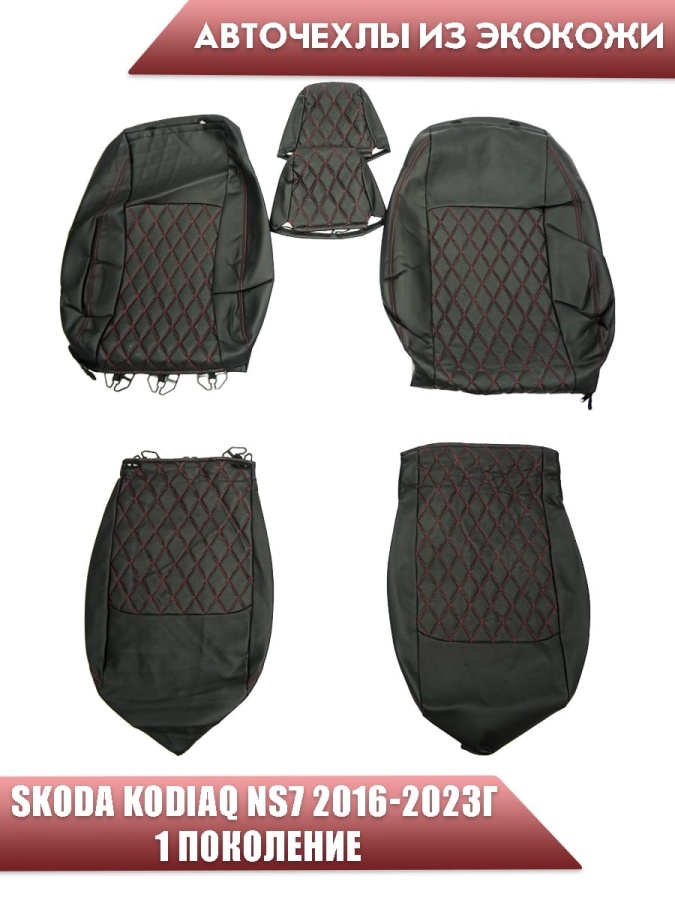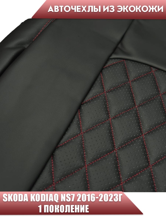 Авточехлы Skoda KODIAQ NS7 Шкода Кодиак 2016-2023г экокожа черная красная нить ромб