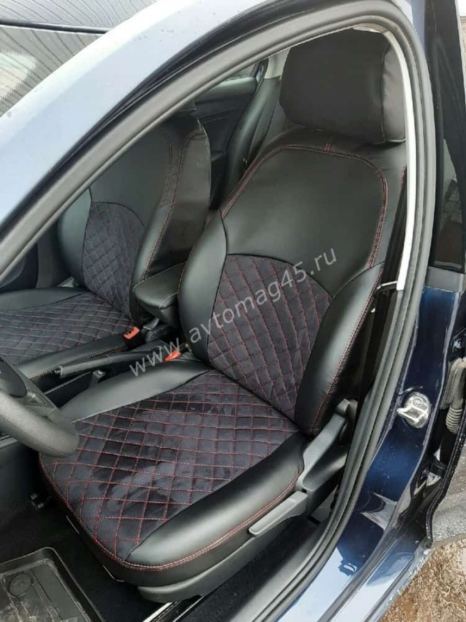 Авточехлы Skoda Rapid с 2012г 2/3 Volkswagen Polo л/б с 2020г экокожа алькантара черная крас.н ромб