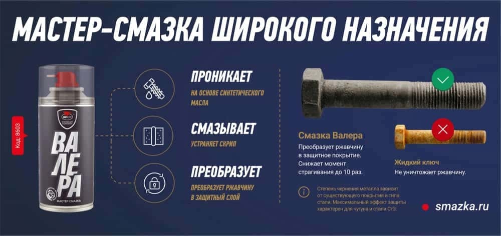 Проникающая синтетическая мастер-смазка, преобразующая ржавчину в защитный слой. Это продукт, сочетающий преимущества жидкого ключа, смазки и преобразователя ржавчины. Подходит для широкого применения: от смазывания петель до разборки заржавевших соединений. Смазка ВАЛЕРА смазывает механизмы до 5 раз эффективнее проникающих смазок. Одновременно останавливает образование коррозии и создает стойкое защитное покрытие. Продлевает срок службы неразборных механизмов (тросиков, замков и т.д.). Не содержит кислот, керосина, минерального масла. Облегчает страгивание при демонтаже, после обработки создает защитное покрытие. Синтетическая основа продукта нейтральна к резине и пластику и не замерзает до -50 градусов.