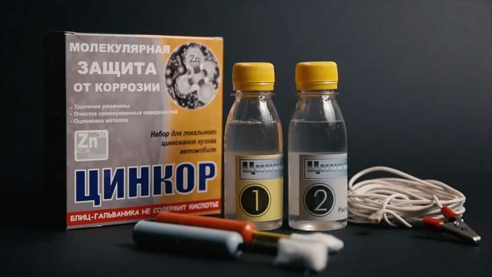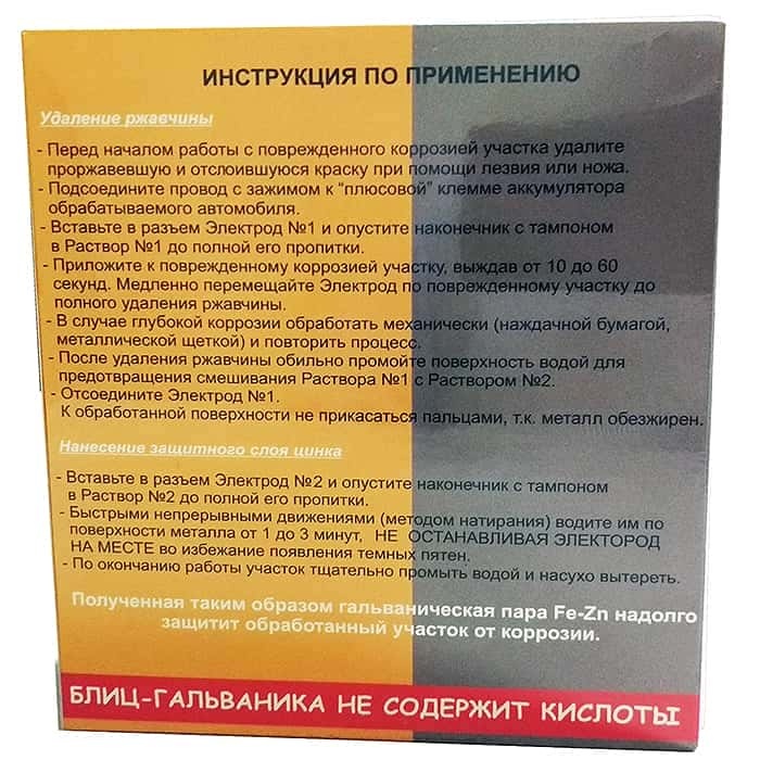 Набор представляет собой комплект для локального удаления ржавчины и последующей оцинковки поверхности кузова автомобиля гальваническим методом.