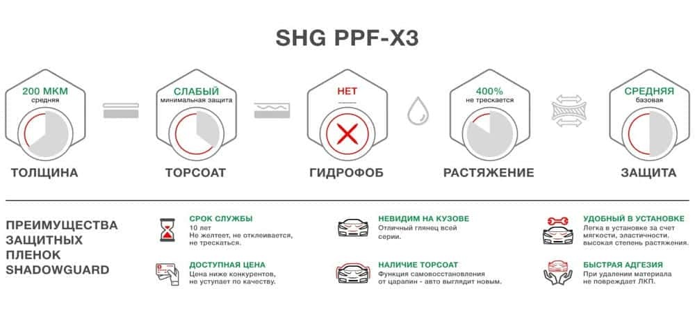 Полиуретановая антигравийная плёнка Shadow Guard PPF-X3 – это самовосстанавливающаяся, абсолютно прозрачная, супер глянцевая антигравийная полиуретановая пленка БЕЗ гидрофобного покрытия для защиты лакокрасочного покрытия элементов кузова автомобилей, поставляется под разными известными брендами на рынки Европы, Азии и США на протяжении последних 3-х лет.