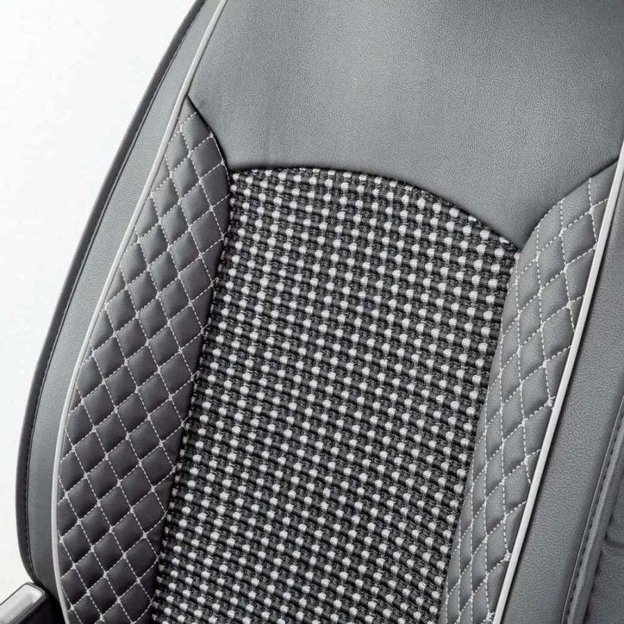 Комплект универсальных накидок на передние сиденья CAR PERFORMANCE из экокожи с контрастной прострочкой, обеспечивающих защиту заводской обшивки передних кресел. Оригинальный дизайн с центральной тканевой вставкой с объемным контрастным плетением дополнят интерьер салона любого автомобиля, а прочный и приятный к телу материал увеличивает срок службы накидки и защищает ее от загрязнений.