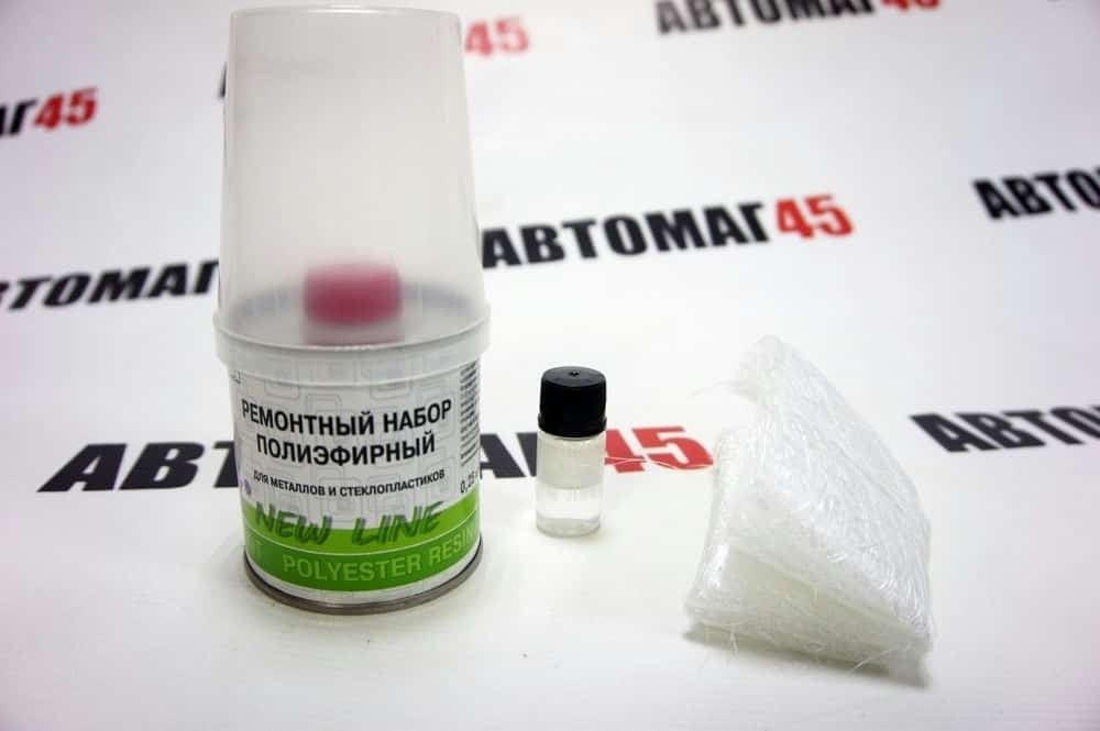 Набор состоит из полиэфирной смолы, отвердителя и стеклоткани. Применяется для ремонта повреждений деталей и востановление требуемой формы из металла, пластика и т.п.