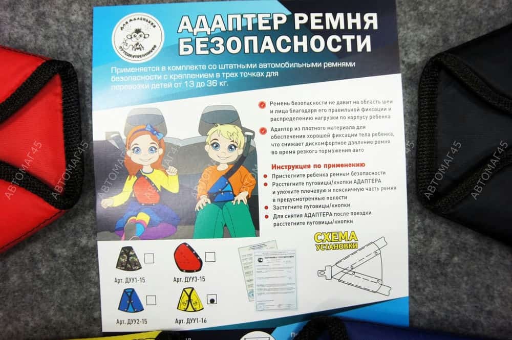 Это адаптер под маленький рост ребенка для ремня безопасности. Адаптер ремня безопасности предназначен для детей весом от 9 до 36 кг. Устройство скроено таким образом, что автомобильный ремень безопасности проходит ниже линии шей ребенка и фиксирует его в нужном положении. ДУУ Крепыш устанавливается на штатный ремень безопасности, не ограничивая его функциональность. Разрешено ГИБДД.