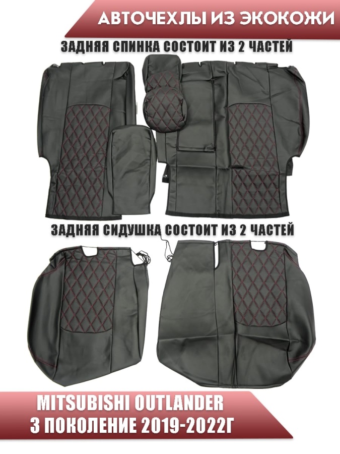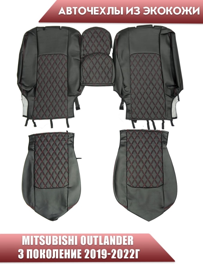 Авточехлы Mitsubishi Outlander Мицубиси Аутлендер 3 пок 2019-2022г экокожа черная красная нить ромб