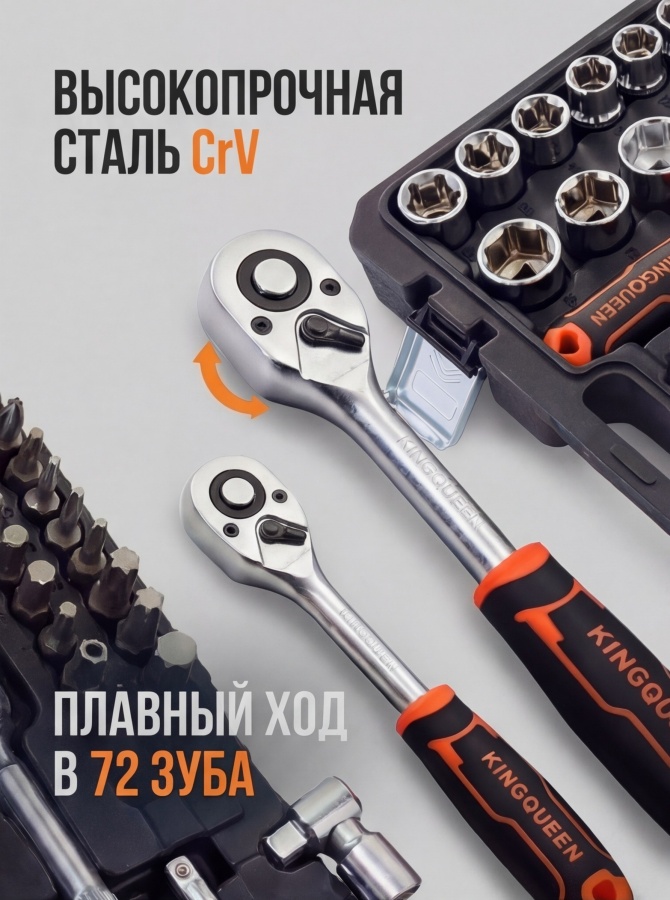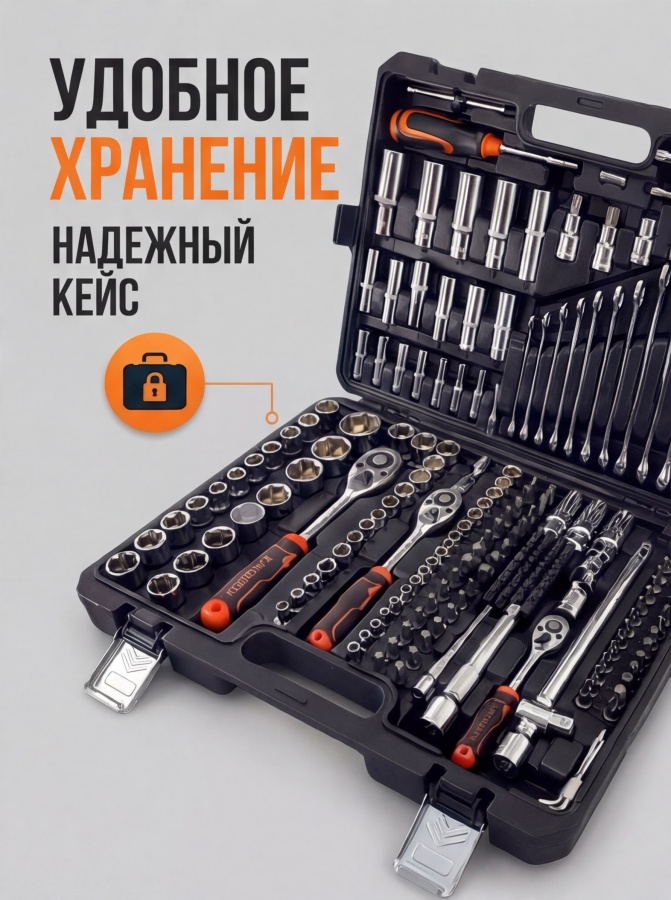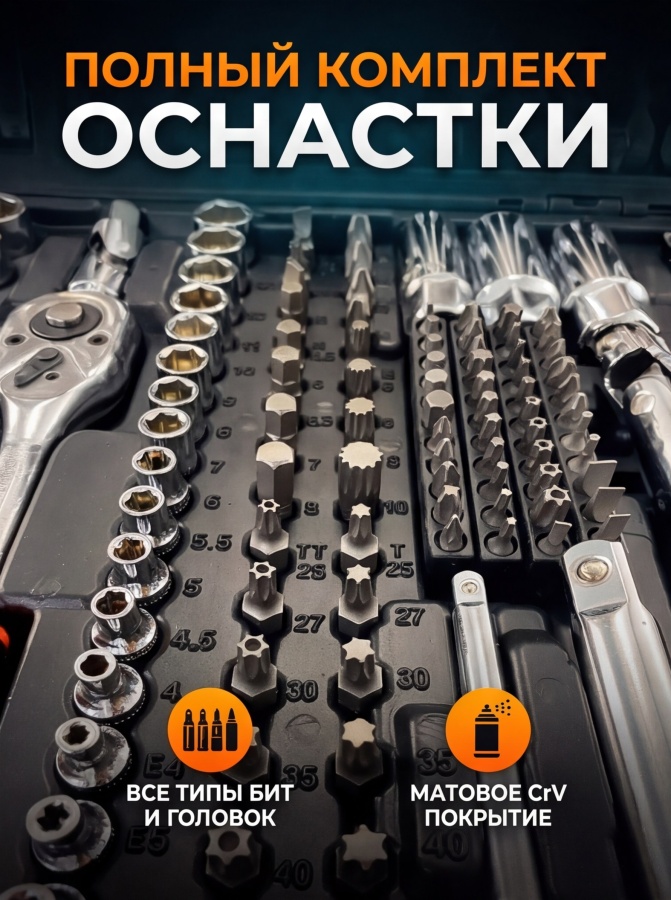Торцевые головки 1/4": 4, 4.5, 5, 5.5, 6, 7, 8, 9, 10, 11, 12, 13, 14 мм; Глубокие головки 1/4": 4, 5, 6, 7,8 8, 9, 10 мм; Головки E-типа: E4, E5, Е6, Е7, Е8 мм; Удлинители 1/4": 50 и 100 мм; Универсальный шарнир 1/4"; Вороток с плавающим квадратом; Отвертка-вороток 1/4" 150 мм; Держатель бит 1/4"; Трещотка 1/4"; Отвертка под биты 1/4"; Головки со вставками 1/4": TX8-9-10-15-20-25-27-30, TT8-9-10-15-20-25-27-30, PZ1-2-3, PH1-2-3, FD4-5.5-7, HEX3-4-5-6-8; Биты 25мм: H2-2.5-3-4-5-6, PH0-1-2-3, PZ0-1-2-3, T8-9-10-15-20-25-27-30-40, TT8-9-10-15-20-25-27-30-40, SL3-4-5.5-6.5, S1-2, TriWing1-2-3, TORQ6-8-10 Биты 30мм: FD6-6.5-8, PZ3-4, PH3-4, TX25-27-30-35-40-45-50, HEX5.5-6-6.5-7-8, M5-8-10, TT25-27-30-35-40-45-50 Торцевые головки 3/8: 10, 11, 12, 13, 14, 15, 16, 17, 18, 19 мм; Глубокие головки 3/8": 10, 11, 12, 13, 14, 15, 16, 17, 18, 19 мм; Головки Е-типа 3/8": E8, Е10, Е11, Е12, Е14, Е16 мм; Удлинитель 3/8" 150 мм; Универсальный шарнир 3/8"; Трещотка 3/8"; Свечная головка 3/8" 21 мм; Держатель бит 3/8" 5/16"; Торцевые головки 1/2": 10, 11, 12, 13, 14, 15, 17, 19, 20, 21, 22, 24, 27, 30, 32 мм; Глубокие головки 1/2": 16, 17, 18, 19, 22 мм; Головки Е-типа 1/2": Е18, Е20, Е22, Е24 мм; Удлинитель 1/2": 125 и 250 мм; Свечные головки 1/2": 16 и 21 мм; Универсальный шарнир 1/2"; Трехсторонний адаптер 1/2"; Головки со вставками 1/2": Т55 и Т60; Держатель бит 1/2" 5/16"; Комбинированные ключи: 8, 9, 10, 11, 12, 13, 14, 15, 16, 17, 18, 19 мм; Шестигранные ключи: 1.27, 1.5, 2.5, 3, 4, 5 мм