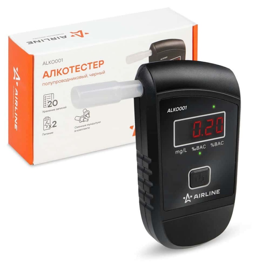 Алкотестер — предназначен для измерения концентрации алкоголя в выдыхаемом человеком воздухе или в крови человека по выдыхаемому воздуху. Прибор может использоваться как в целях проверки самого себя, так и для проверки большого количества людей, например в автопарке, на производстве перед началом рабочего дня. Высокая точность измерений за счет современного полупроводникового сенсора с нагревательным элементом. Погрешность всего 0,05mg/L. Алкотестер подойдет как для подарка, так и для личного использования перед началом поездки. Преимущества: Хранение 20 записей Компактный и простой в использовании 3 разных обозначения (‰BAC, %BAC, mg/L)