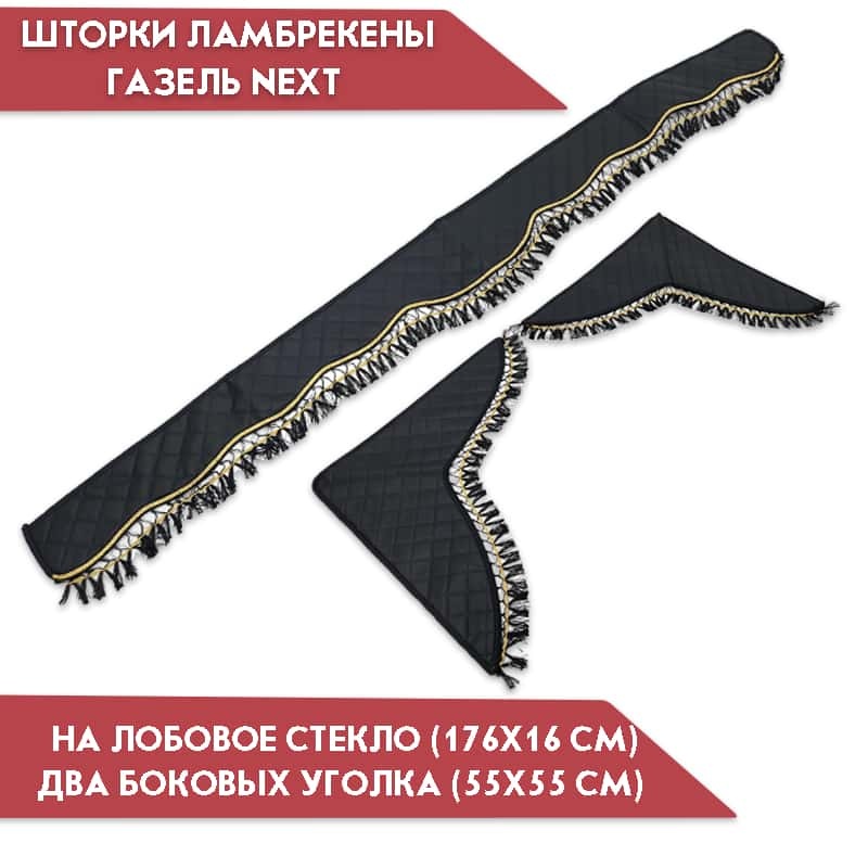 Комплект состоит из 3-х частей: - ламбрекен на лобовое стекло (176х16 см) - два боковых уголка (55x55 см)