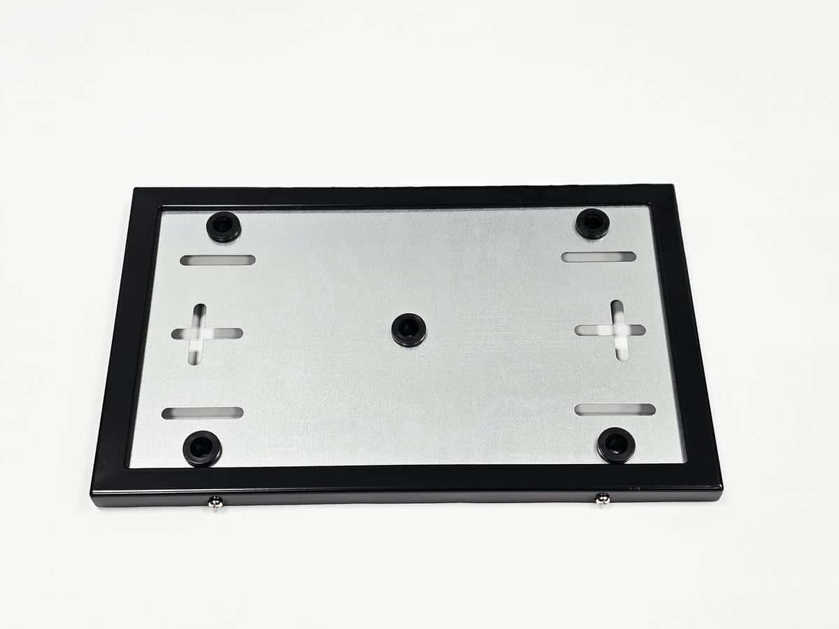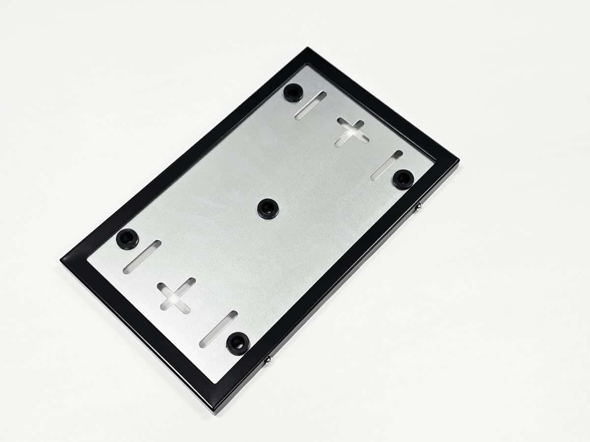 В основании рамки выполнено большое количество прорезей, сквозь которые можно прикрутить рамку к автомобилю. Подходит как к японским (расстояние между крепежными отверстиями 210 мм), так и к американским авто (расстояние между крепежными отверстиями 178х120 мм).