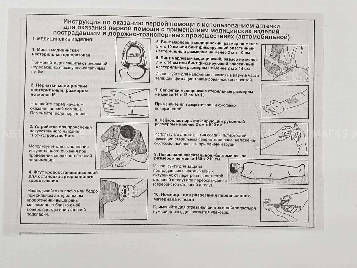 10. Ножницы для разрезания перевязочного материала и ткани - 1 шт. 11. Инструкция по оказанию первой помощи - 1 шт.