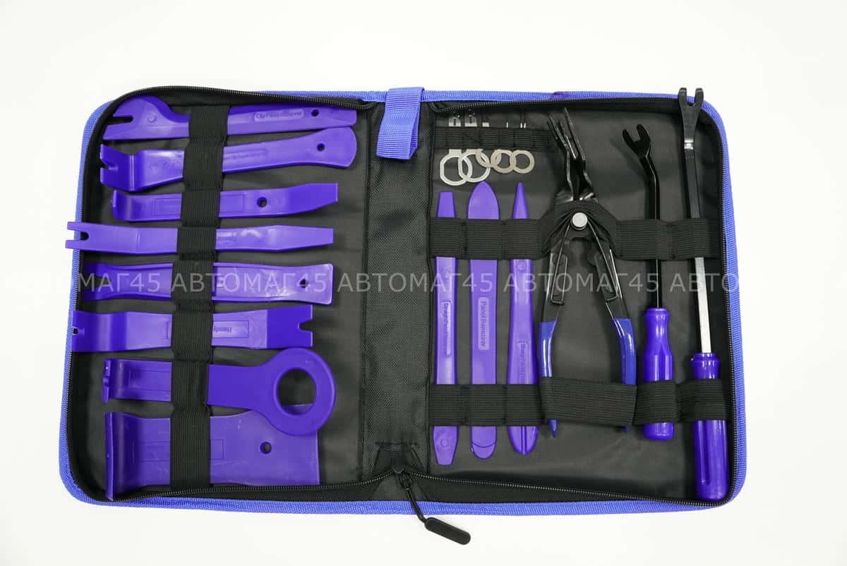 В наборах присутствует различные виды наборов ключей съемников лопатки, скребок для стекол, шпатель, ключи, вилочки и клипсодеры для работ: обшивки салона, инструмент для разборки салона; Облицовки панелей и клипс. Набор для установки и снятия радио/cd проигрывателя автомобиля и др.