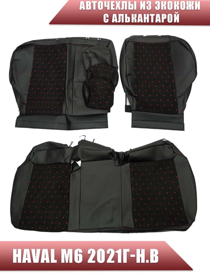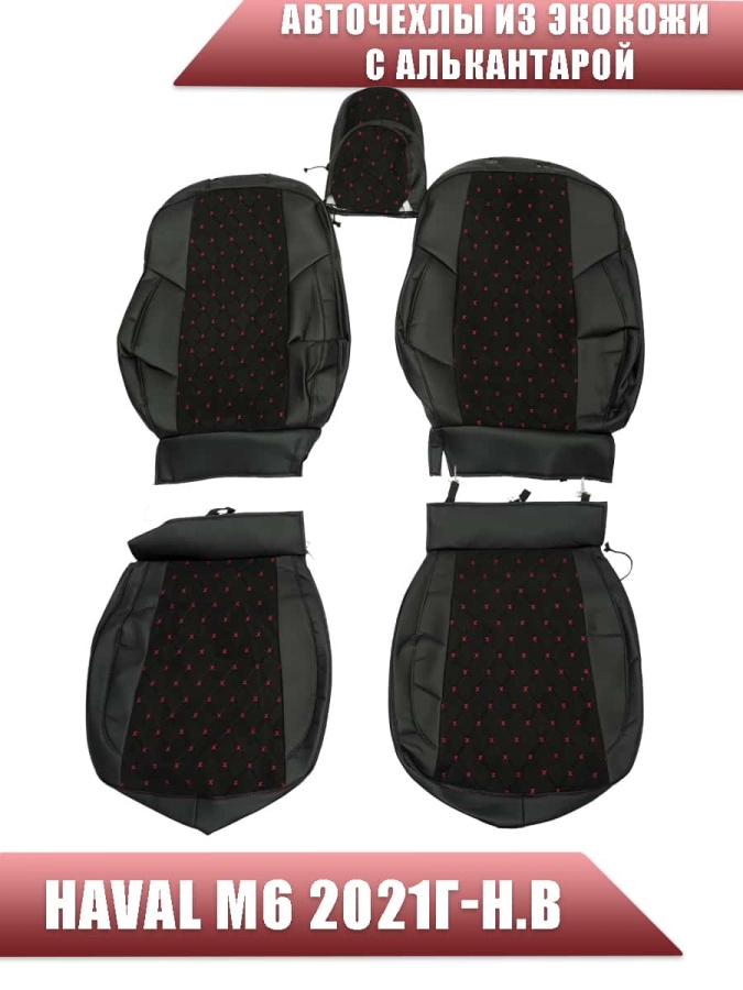 Авточехлы Haval M6 Хавал М6 2021г-н.в. экокожа алькантара черная красная нить ромб