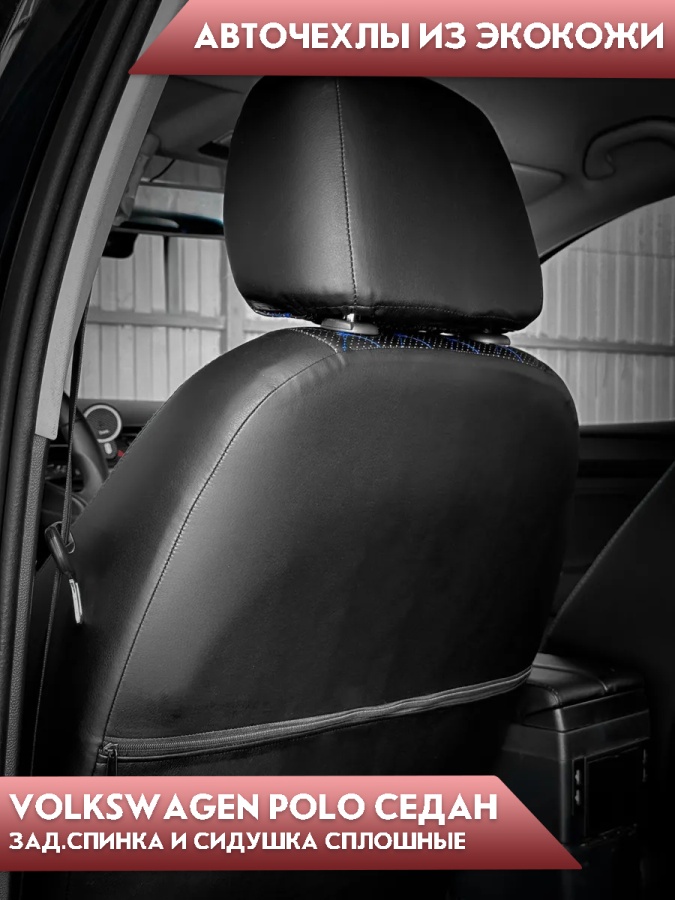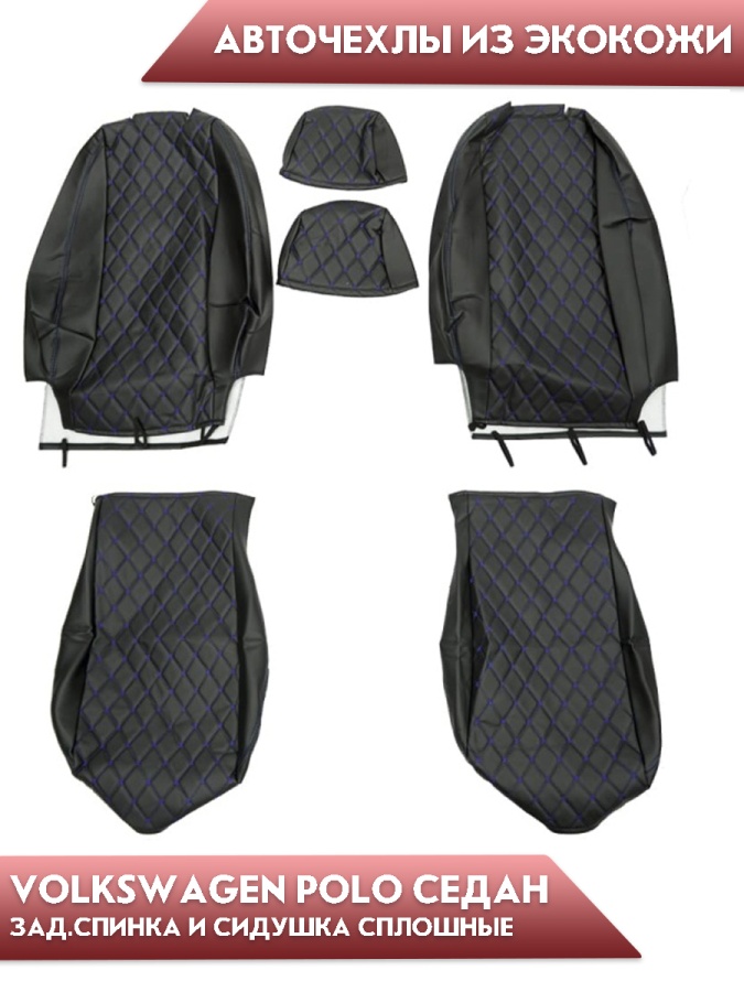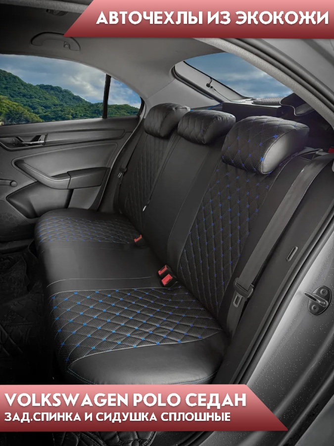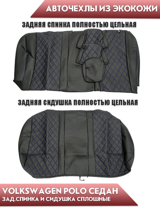 Авточехлы Volkswagen Polo Фольцваген Поло седан 1/1 2010-2020г экокожа черная нить синяя ромб Барс