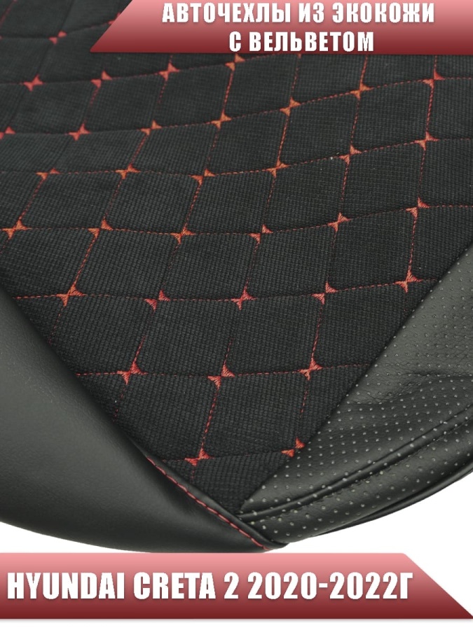 Авточехлы Hyundai Creta 2 Хендай Крета 2 2020-2022г экокожа вельвет черная красная нить ромб