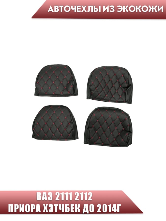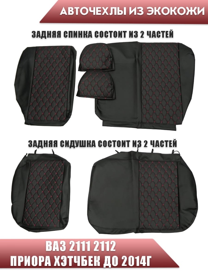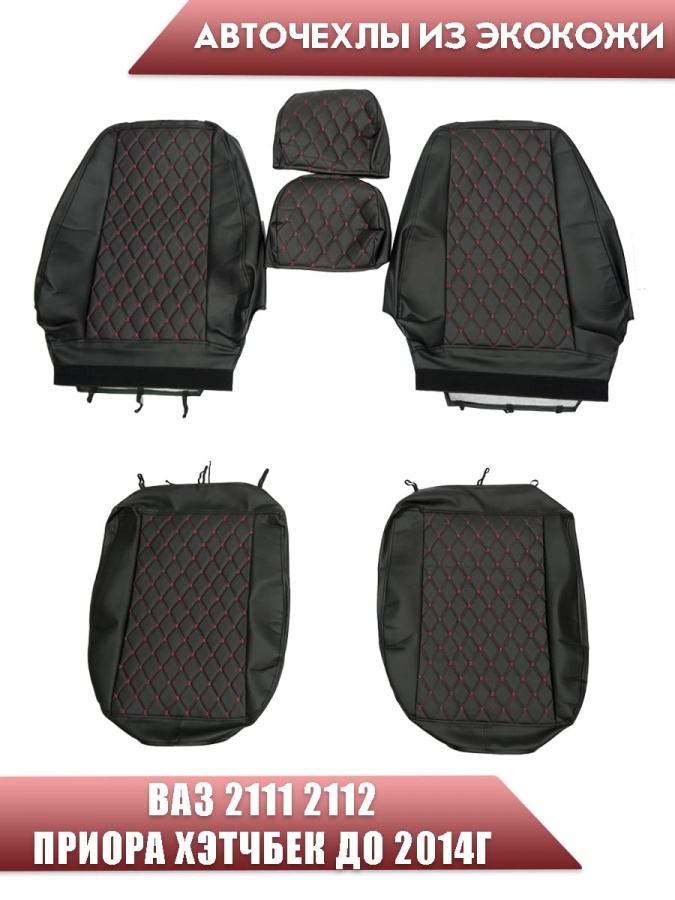 Авточехлы ВАЗ 2111 2112 Приора хэтчбек до 2014г экокожа черная с красной ниткой ромб бабочка